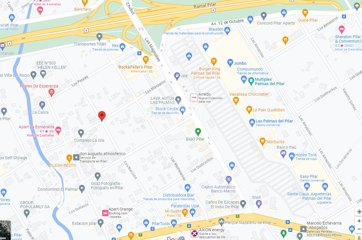 Ubicado a solo 200 metros de la calle Las Magnolias, frente al Shopping Las Palmas del Pilar, próximo al Hotel Ibis y todas las ofertas gastronómicas y recreativas que el Km 50 tiene para ofrecer. Se encuentra en un entorno agradable, en contacto con la naturaleza pero a unos pocos pasos de todas las comodidades de la ciudad. Está a 200 metros de la colectora Panamericana 12 de Octubre ya 300 metros de la ex Rta 8 (Av. Stgo. Cayetano Beliera) altura Ruta 234.